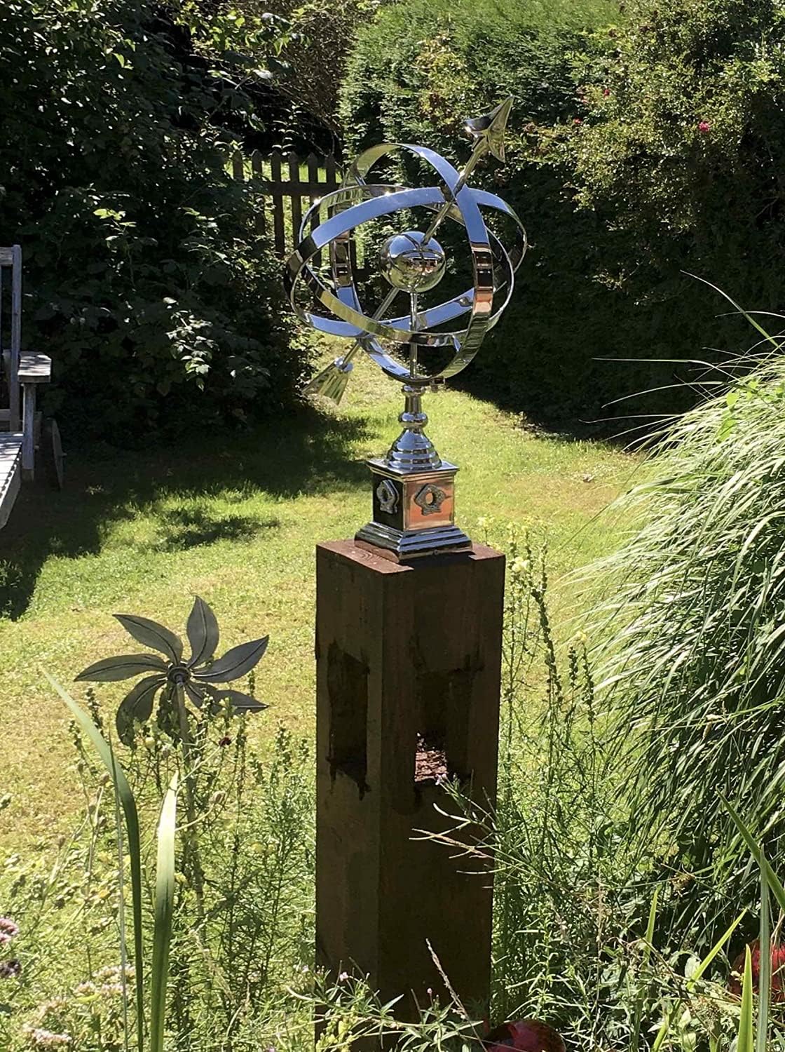 Wunderschöne Sonnenuhr aus vernickeltem Aluminium, nach altem Vorbild hergestellt. Wie auf den Fotos zu sehen, eine hochwertige und dekorative Arbeit im antiken Stil. Durch Handarbeit wird der Artikel traditionell bearbeitet, um ein antikes Erscheinungsbild zu erhalten. Es gibt minimale Abweichungen. Die Maße der Sonnenuhr lauten wie folgt: 40 x 59 x 32cm (B x H x T). Vielen Dank lieber Kunde für das tolle Foto mit der Sonnenuhr in Deinem Garten. Darüber haben wir uns sehr gefreut :-)